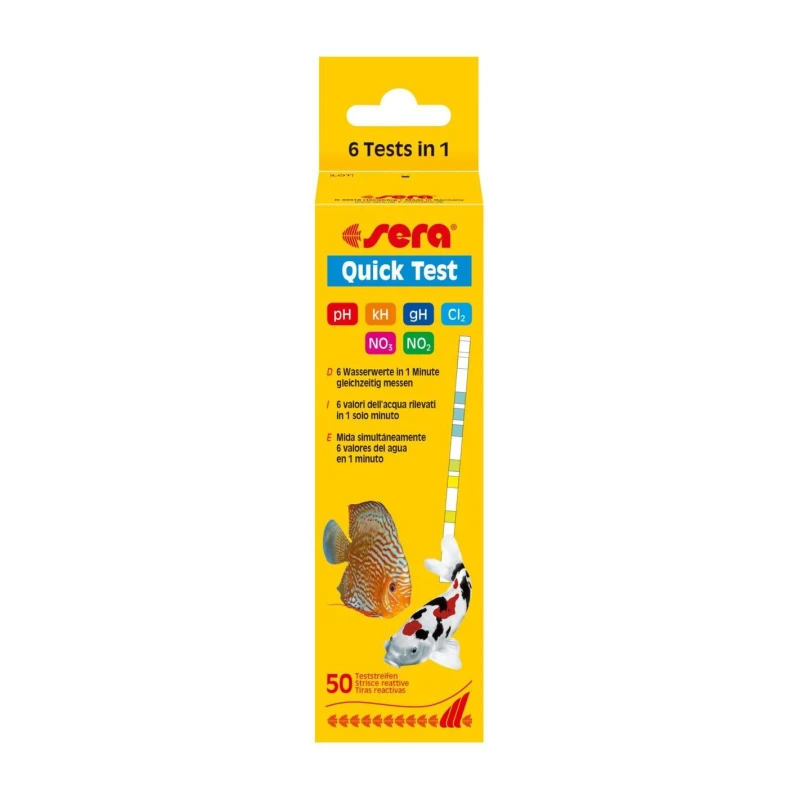 Con el Quick Test, sera ofrece la posibilidad óptima de verificar rápidamente y sin problemas los parámetros del agua más importantes en el acuario (valor de pH, dureza de carbonatos, dureza total, nitrato, nitrito y cloro) - solo con una tira reactiva.