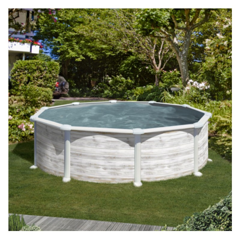 Esta nueva gama de piscinas llamada Groenlandia de acero blanco envejecido Nordic en forma redonda se entrega con todo el equipamiento necesario para el montaje y la puesta en marcha de la piscina: pared de acero, depuradora de arena, liner, skimmer, escalera de seguridad y tapiz de suelo.