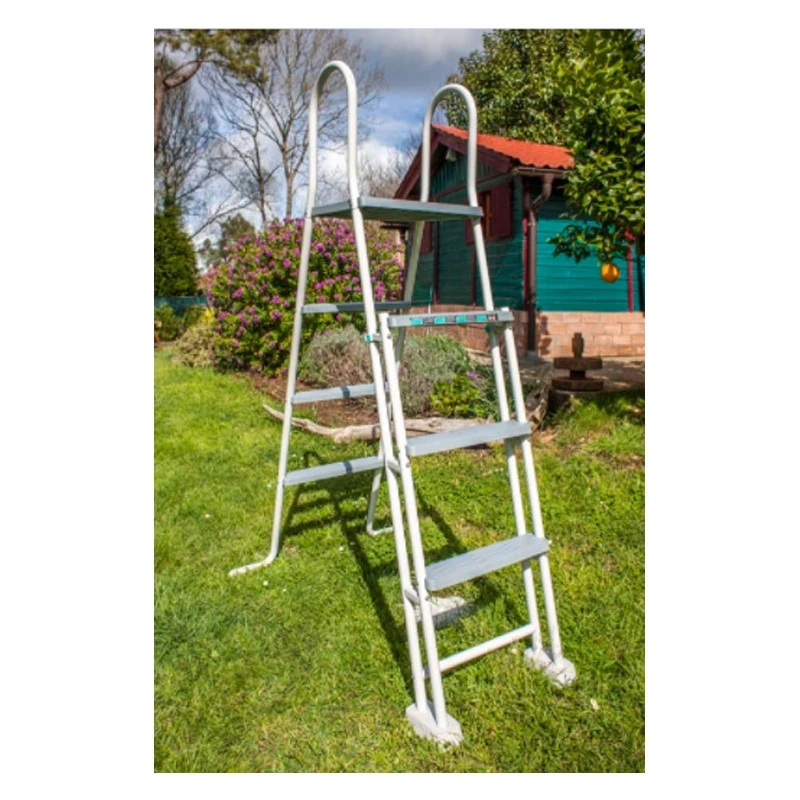 • Escalera de seguridad con plataforma y 6 peldaños (3x2). Permite desmontar los peldaños de un lado para impedir el acceso de los niños a la piscina y prevenir accidentes. Conforme a la norma Europea
