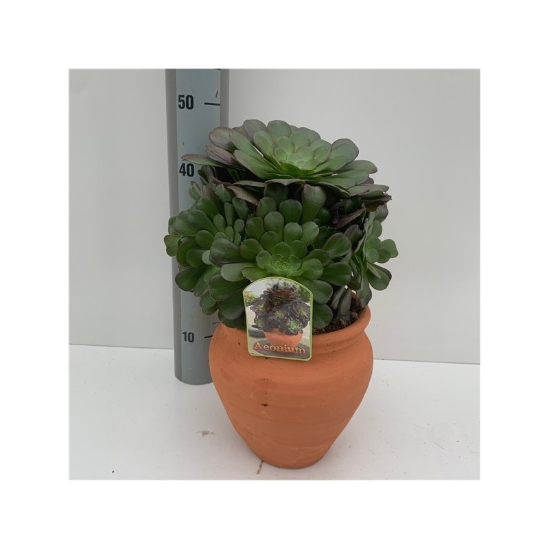 La crasa Aeonium arboreum puede alcanzan 1 metro de altura y tiene grandes rosetas de hojas al final del tallo que son de color negro o, en climas cálidos como el mediterráneo, de color púrpura. Producen pequeñas y abundantes flores amarillas en inflorescencias cónicas. Florecen desde el invierno hasta inicios de la primavera. Se vende con la tinaja de barro.