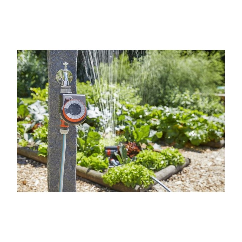 Con el programador de riego Gardena Easy puedes poner el marcha o parar el riego fácilmente. Funciona con materia y simplemente se conecta al grifo y se ajusta con el botón rotador. Para regar puedes seleccionar uno de los 17 programas preconfigurados variando la duración y la frecuencia. La función de retraso del inicio en ciclos de una hora controla el funcionamiento de un aspersor o un riego por goteo en el momento que lo desees. Lo mejor es regar pronto por la mañana o a última hora del día. Su unidad resistente a la climatología se puede desmontar.