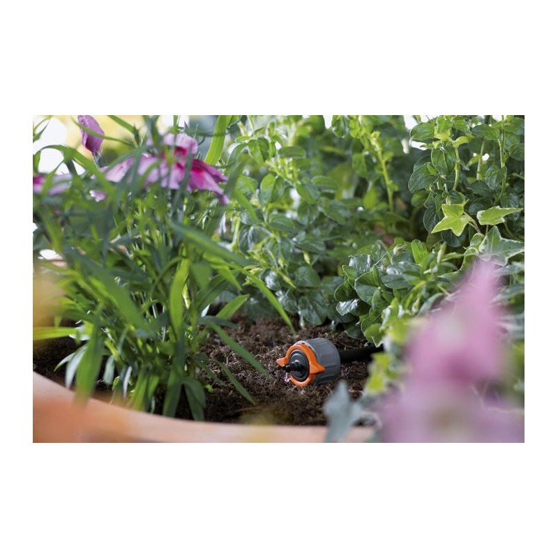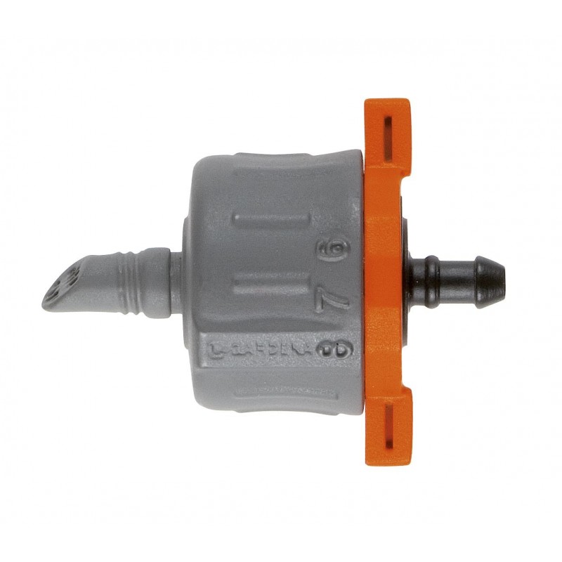 Innovador riego por goteo, constante y regulable. El gotero fin de línea ajustable regulador de presión forma parte del sistema Micro Drip Gardena indicado para el riego por goteo de plantas individuales o de hileras de plantas con diferentes requerimientos de agua. La cantidad de agua puede regularse con la escala de volumen del gotero, pueden suministrarse de 1 a 8 litros por hora. Regula la presión (de 1 a 4 bar) para garantizar que la distribución de agua es uniforme. Gracias a la tecnología de membrana de laberinto autolimpiante, se garantiza un funcionamiento seguro a largo plazo. El gotero fin de línea se conecta al extremo de un tubo de distribución (3/16"). Puede utilizar el punzón multifunción para perforar el tubo de instalación de 13 mm (1/2").