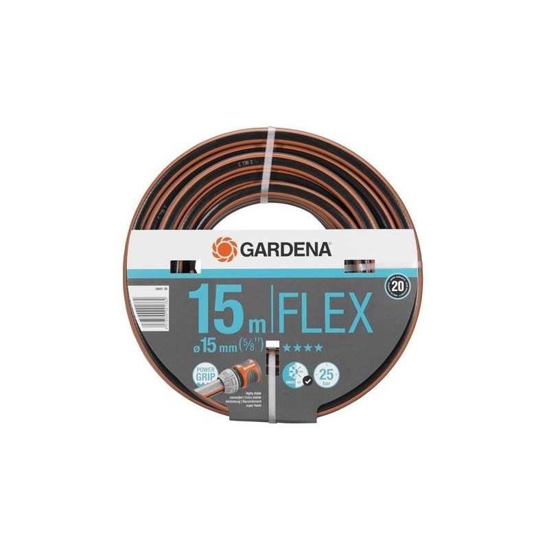 Manguera Comfort FLEX 15 mm (5/8"). Con Power Grip para la conexión perfecta de la manguera al conector rápido. Alta resistencia a la presión e indeformable gracias al refuerzo de carbono de alta calidad. Manguera flexible, no se tuerce ni se dobla,se desliza perfectamente alrededor de los obstáculos.Sin plastificantes nocivos ni metales pesados.Resistente a los rayos Uva. Puede complementarse sistemáticamente con conexiones Original Gardena System. Son las condiciones perfectas para un uso sencillo y flexible en su jardín.