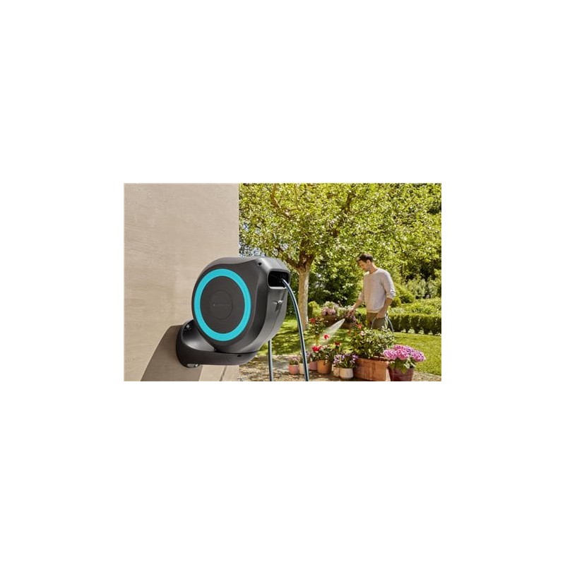 El riego del jardín es más sencillo y sin esfuerzo con el RollUp S mural. El práctico almacenamiento de mangueras se monta simplemente en la pared de su casa y se conecta al grifo con una manguera de conexión flexible. Gracias al resistente soporte de pared, la caja de mangueras se puede girar más de 180 ° para que pueda llegar a todos los rincones de su jardín sin esfuerzo, simplemente extienda la manguera de jardín hasta una longitud máxima de 15 metros. La manguera de jardín se bloquea automáticamente en intervalos particularmente cortos tan pronto como se detiene. Un ligero tirón en el extremo de la manguera libera el bloqueo y un resorte de acero incorporado asegura una retracción suave y controlada.