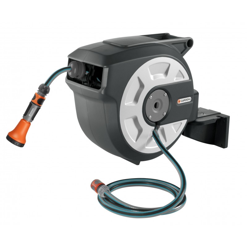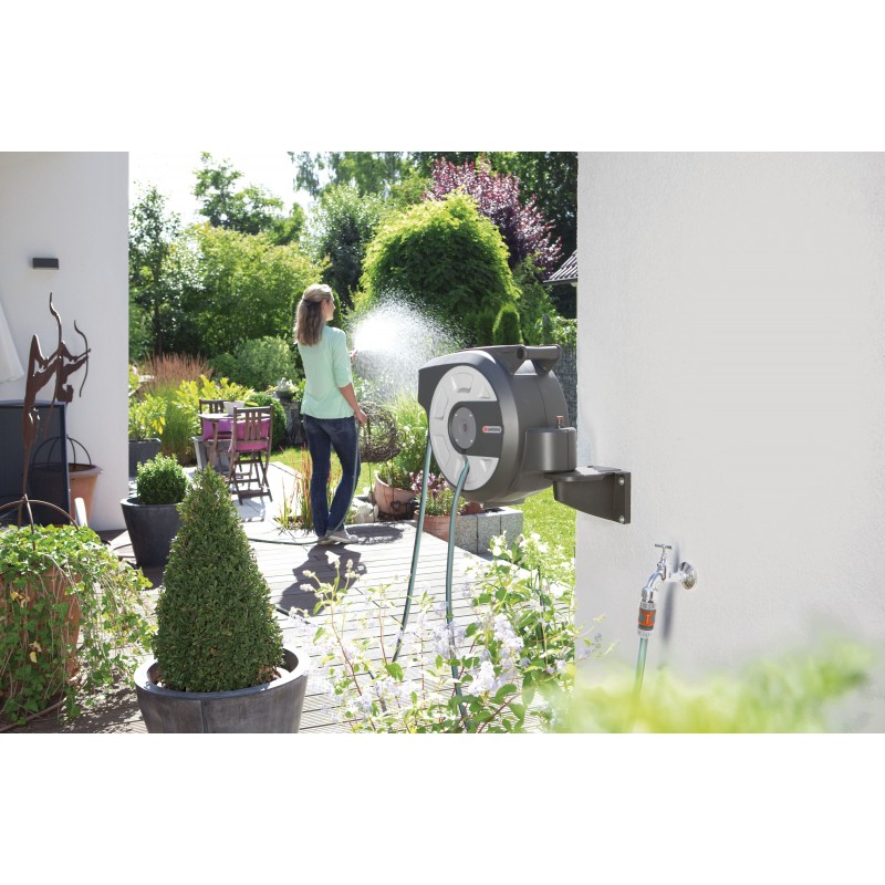 El box de manguera automática de pared 15 m hace que regar sea fácil. La manguera se puede recoger con poco esfuerzo y se para en pequeños intervalos de 50 cm. Su manguera de calidad asegura un buen flujo del agua y riego óptimo. Su resorte de acero se adapta perfectamente a la longitud de la manguera y le da incluso más poder de retracción. La guía integrada de la manguera evita que se tuerza y se doble la manguera. Montarlo es muy sencillo con el soporte de pared, tacos y tornillos que están incluidos en el producto.