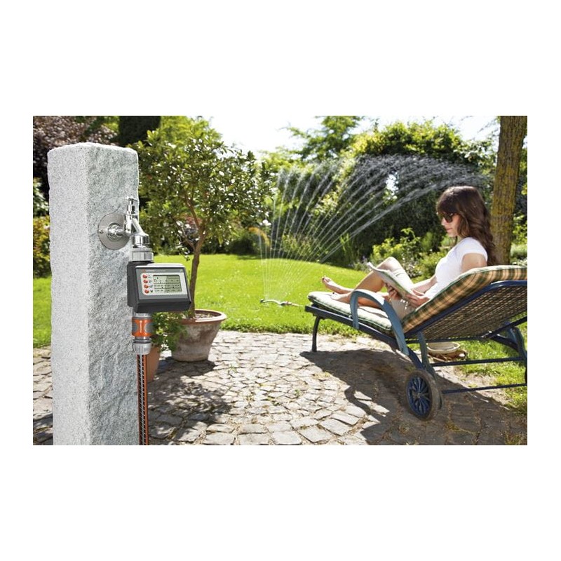El programador está conectado directamente al grifo y controla de forma fiable de riego de acuerdo con la duración y la frecuencia seleccionada. Tiene un panel de control extraíble para hacer el ajuste de la configuración más fácil. La pantalla del programador de riego le permite ver en un vistazo qué ajustes se han programado, sólo tiene que conectar el panel de control de nuevo. Una vez que haya ajustado la configuración, el ordenador controlará el procedimiento de riego con precisión de acuerdo a sus deseos.