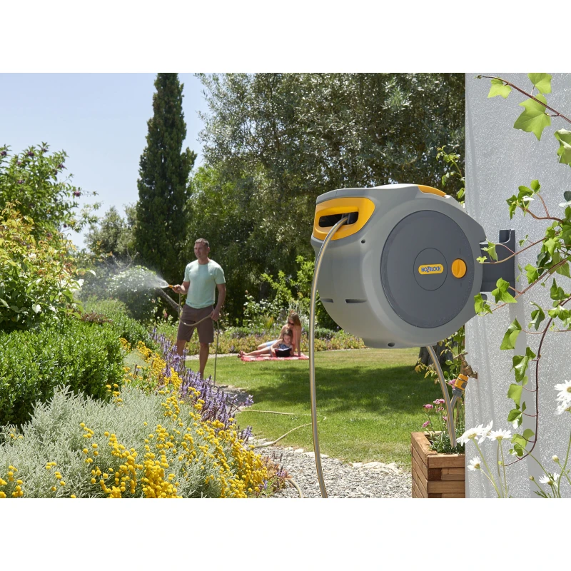 Este carrete de carretilla galvanizado facilita el almacenamiento de su manguera de jardín.