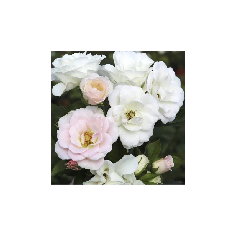 Rosal de porte arbustivo alto con ligera fragancia, ideal para macizos, setos o grupos aislados. Floración abundante y continua muy decorativa en invierno por la gran cantidad de frutos rojos. Flor blanco-rosada. Muy buena resistencia a enfermedades.