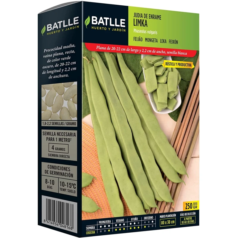 Variedad de precocidad media, rústica, vigorosa y muy adaptable. Producción escalonada. Vaina plana, recta de color verde oscuro de 20-22 cm de longitud y 2 cm de anchura. Semilla blanca.