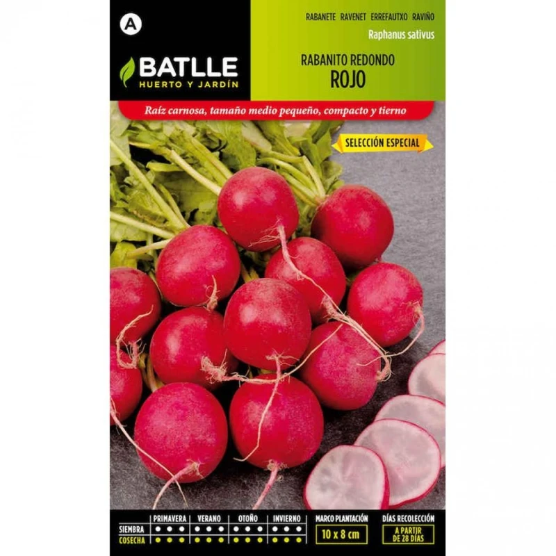 El rábano (Raphanus sativus). Es una planta de la familia Crucíferas, que se cultiva por sus raíces comestibles. Variedad muy precoz, especial para mercado con excelente resistencia a pasarse. Raíz carnosa de tamaño medio a pequeño, compacta, tierna y sabrosa. Apta para cosechar todo el año.