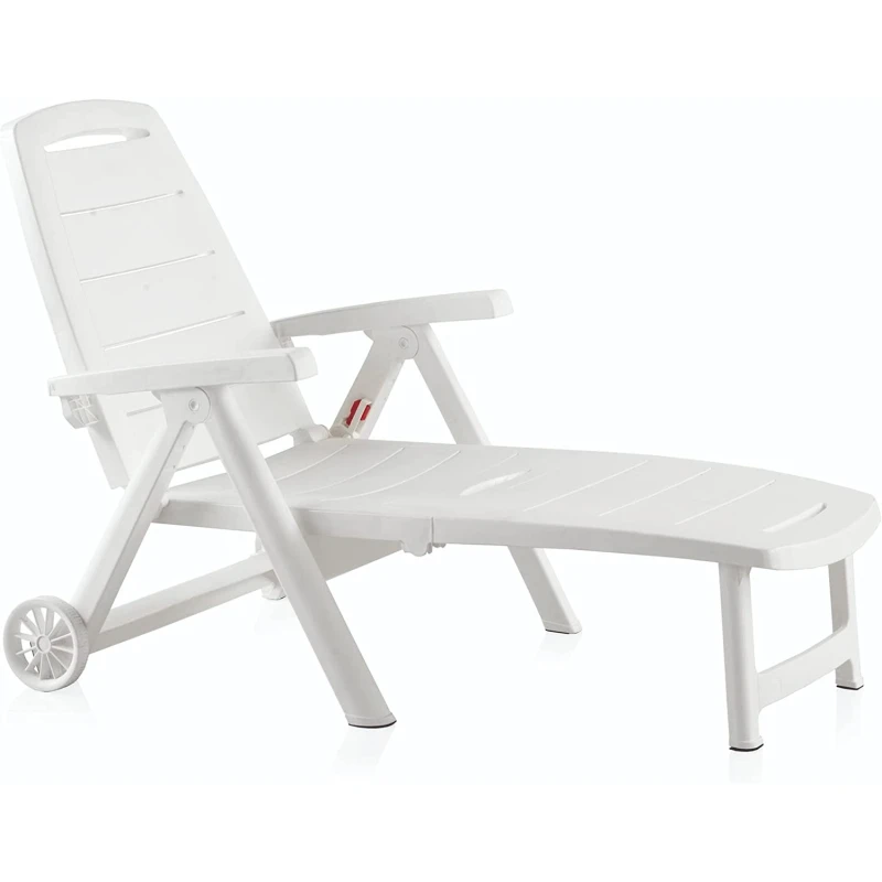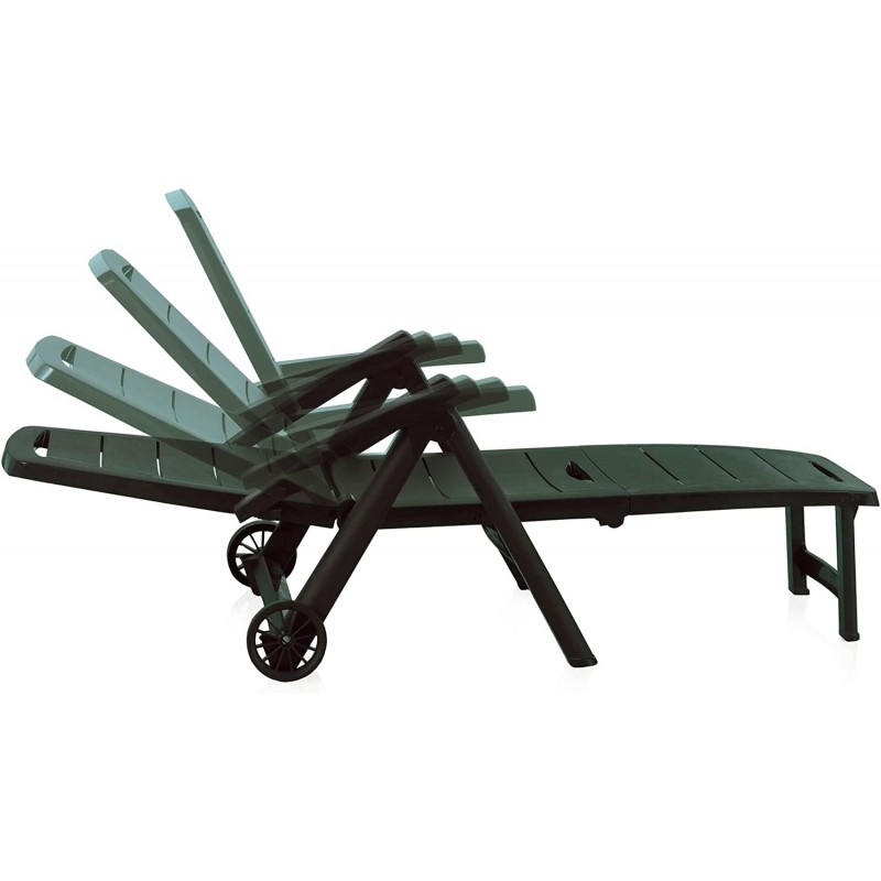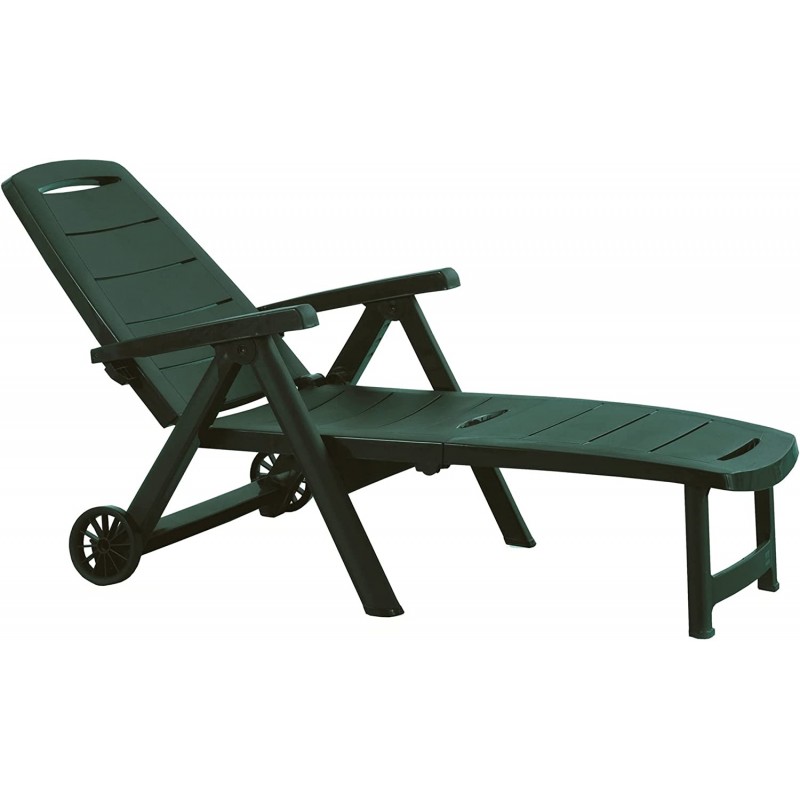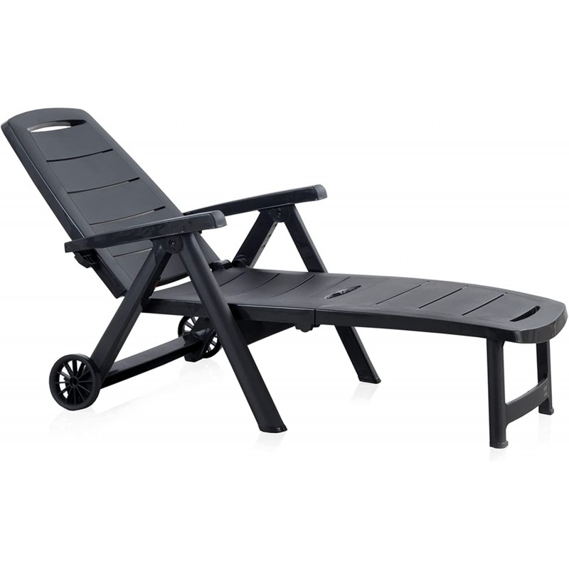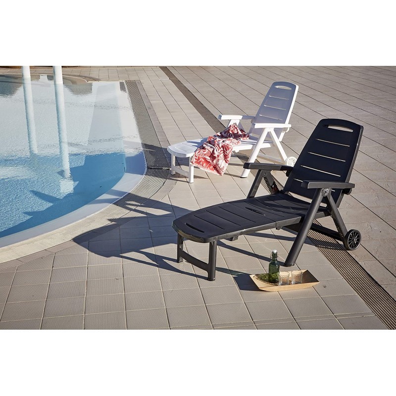Tumbona plegable con respaldo multiposición y equipada con ruedas. Fabricada en resina de alta calidad, resistente a la intemperie y a los rayos UV. Muy fácil de abril y plegar, práctica y funcional, perfecta en el...
